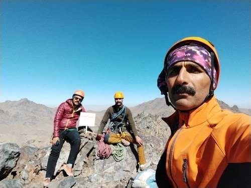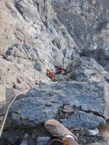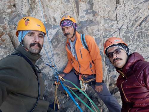 بعد از صعود چهار طول و عبور از شکافها، کنجها، سجافها و پاگسترهای رویایی و زیبا به قله رسیدیم.