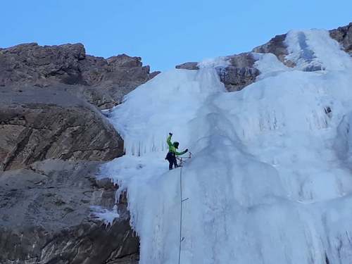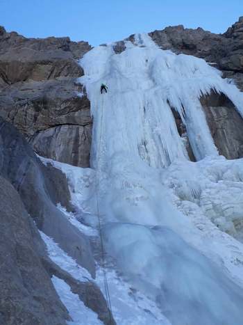 آمادە صعود شده و کار را شروع میکنم. ابتدا چند متر صعود میکنم و یک پیچیخ نصب میکنم. چند متر بالاتر بە یخ بسیار نازکی میرسم کە بە وضوح جریان آب پشت یخ را میبینم. استرس زیادی را تجربە میکنم و احساس میکنم با کوچکترین ضربە، کل آبشار فرو میریزد. ۱ متر بە عقب برمیگردم و در جای مناسبی یک پیچیخ دیگر نصب میکنم و یکی از طنابها را داخل کوییک میزنم تا شکست طناب را بگیرم. شروع بە تراورس بر روی یخ نازک میکنم. بدون ضربە زدن و بە آرامی با کرامپون گیرە میگیرم و تبر را هوک میکنم و از ضربە زدن پرهیز میکنم.