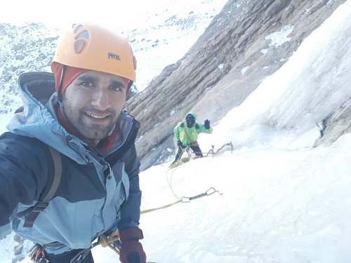 اما اینطرف صعود رحمان بە خوبی پیش میرود و در نهایت پس از ۵۰ متر توسط دو پیچیخ کارگاە زدە و آمادەی حمایت کردن من میشود.
